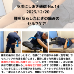 2023年12月20日 / 最終更新日時 : 2024年6月29日 labnishiogi セルフケア 腰をそらしたときの痛みのセルフケア 腰痛があると腰をそらしたときに、筋肉が意識とは関係がなく、勝手に収縮します。これを短縮痛と呼びます。この短縮痛は筋肉の微細損傷があるところに生じます。微細損傷は、筋肉のオーバーユースや過剰な収縮によって生じ、それに伴って […]